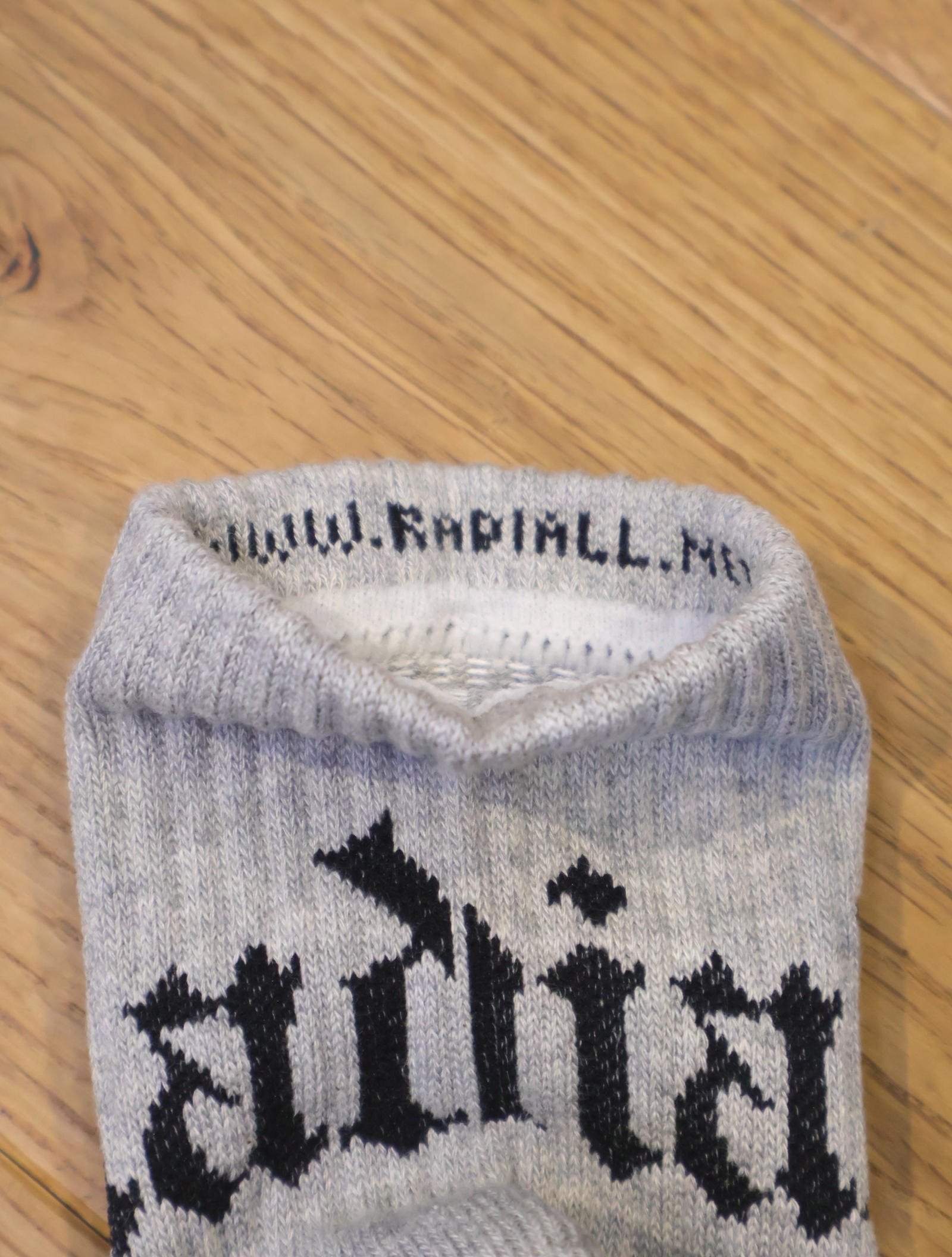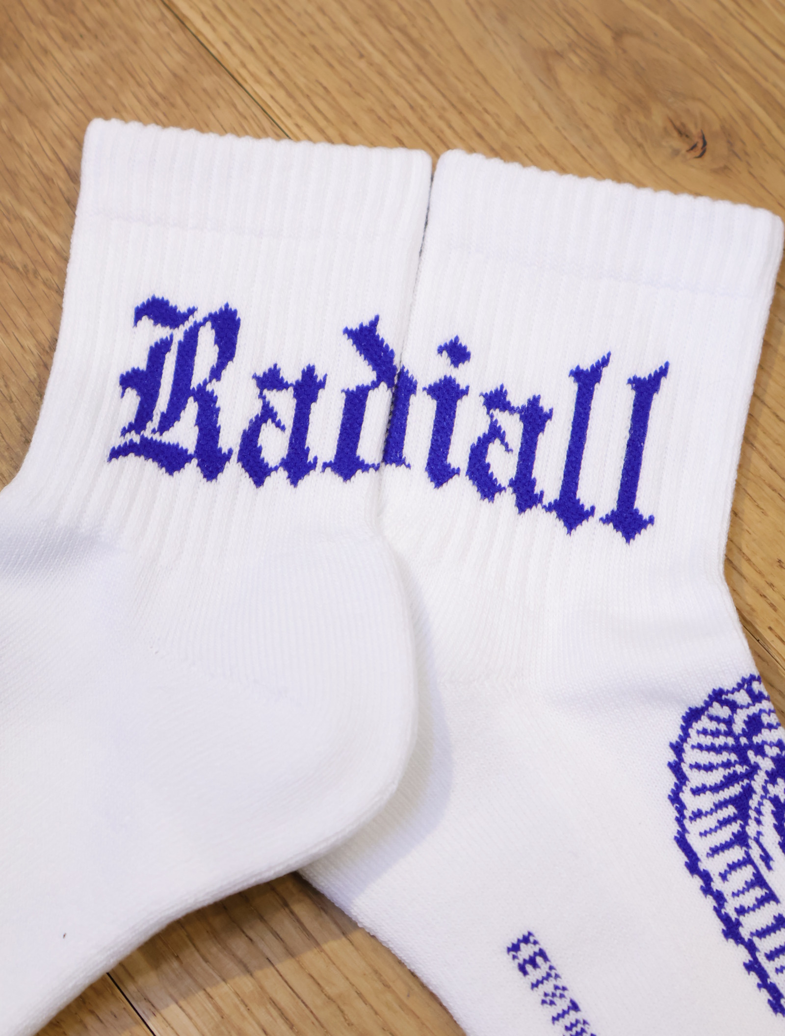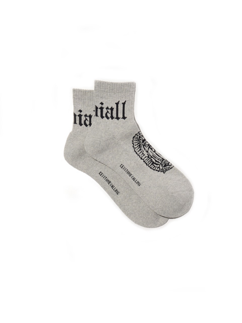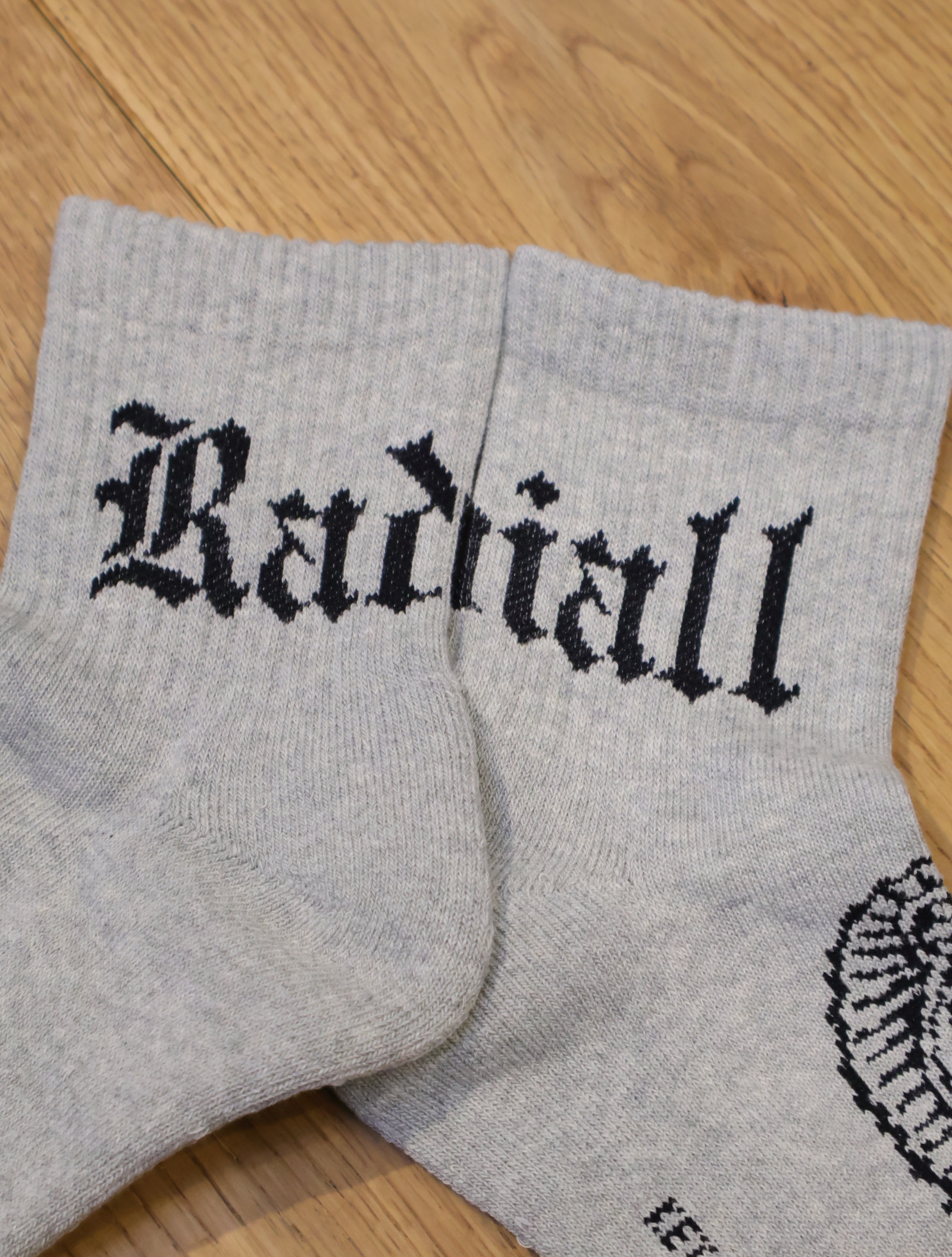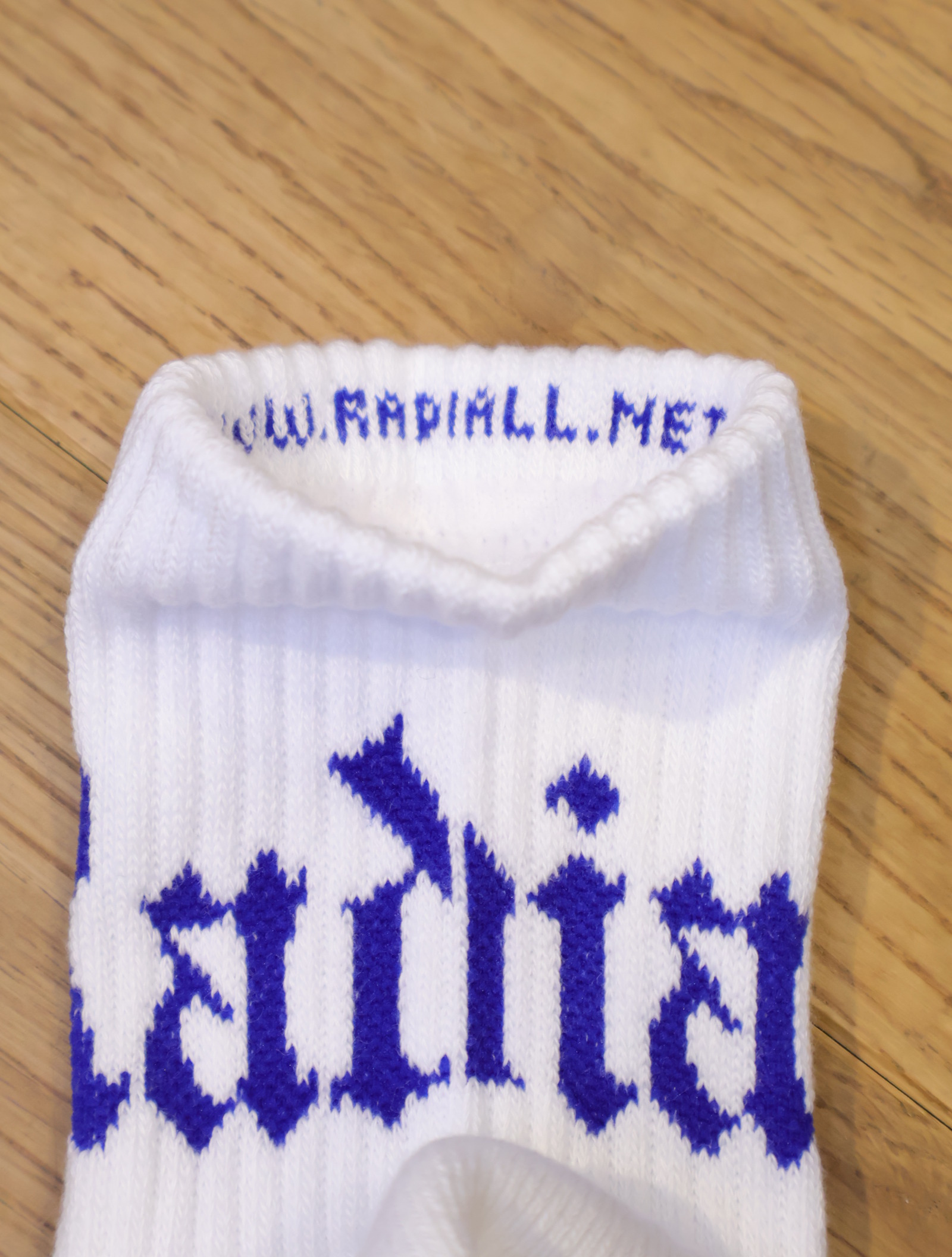 ジャガードで足首裏にブラックレターフォントで「RADIALL」、甲に「レコードマリア」、履き口裏には「WWW.RADIALL.NET]、足底には「KEYSTONE CALLING」とデザインが入ります。