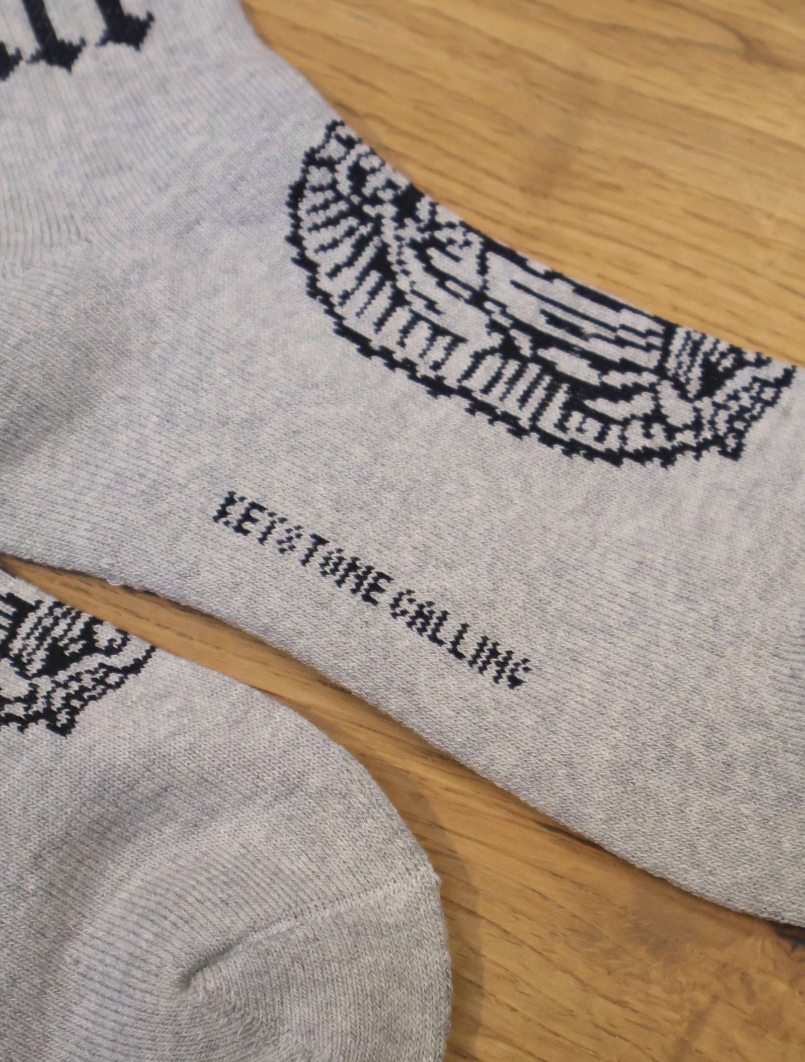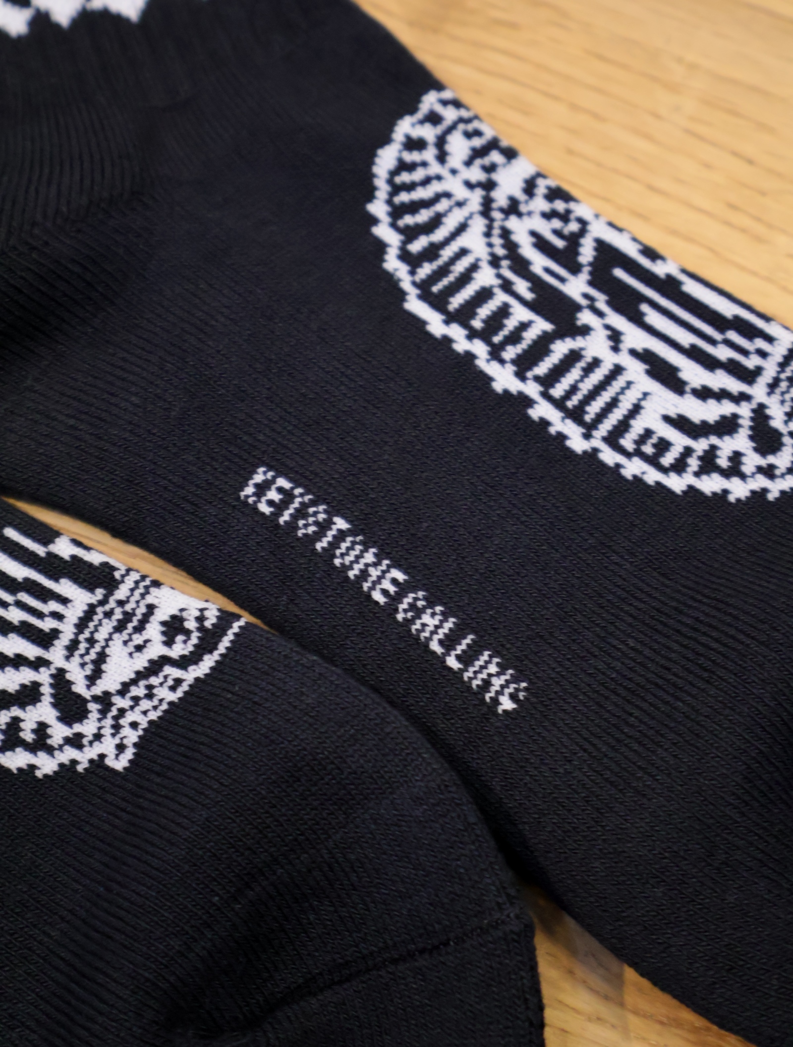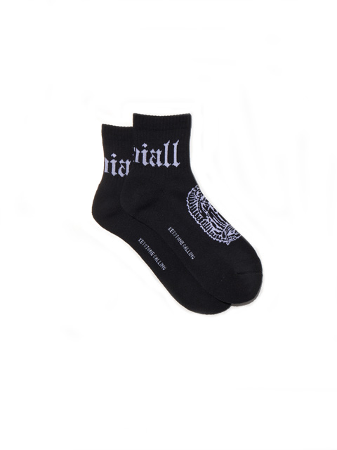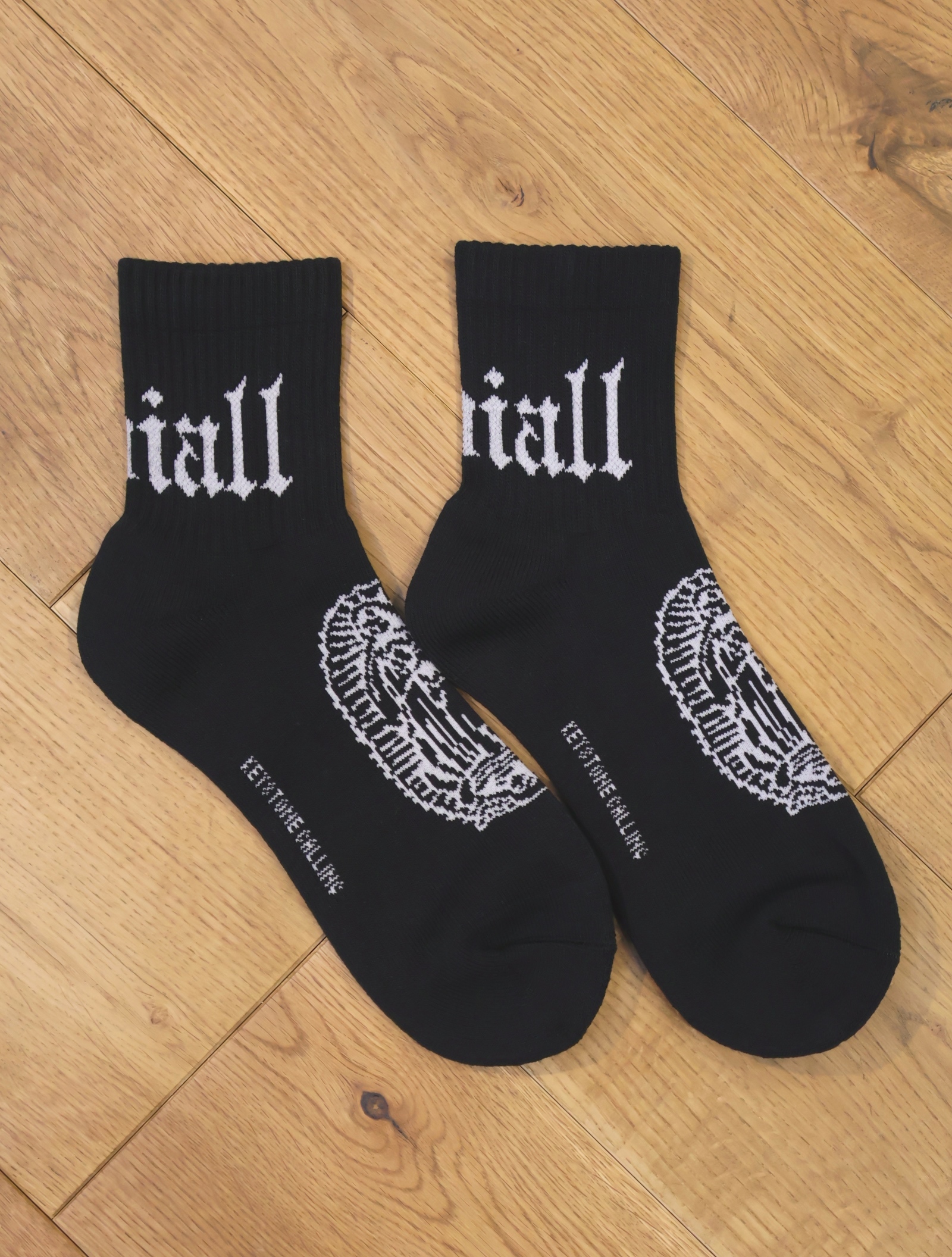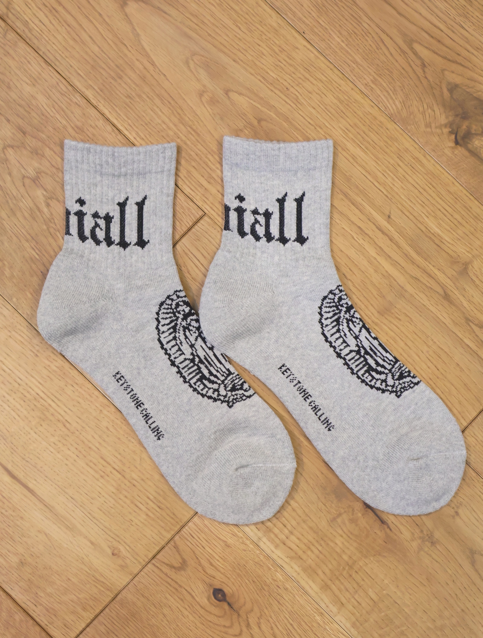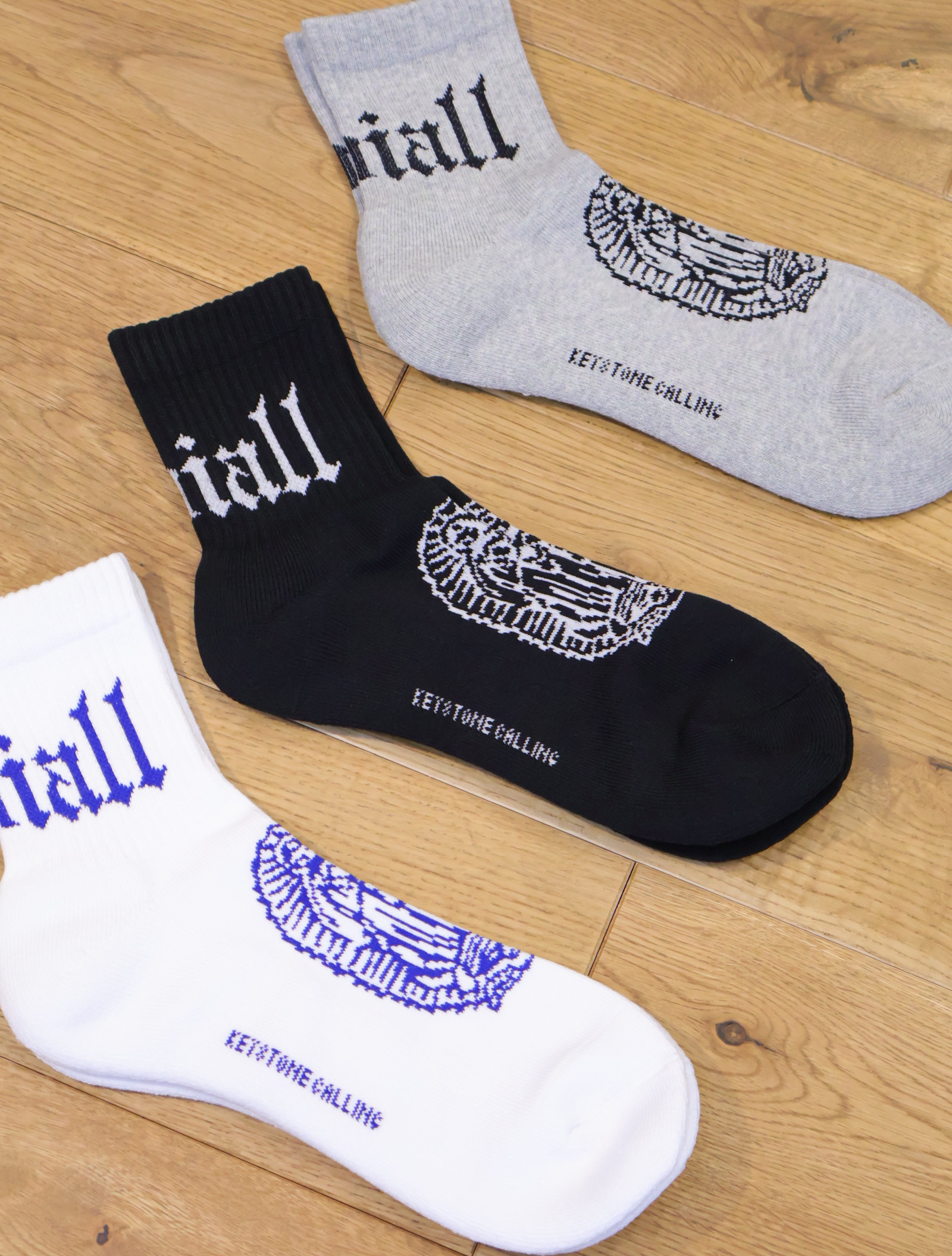 ジャガードで足首裏にブラックレターフォントで「RADIALL」、甲に「レコードマリア」、履き口裏には「WWW.RADIALL.NET]、足底には「KEYSTONE CALLING」とデザインが入ります。