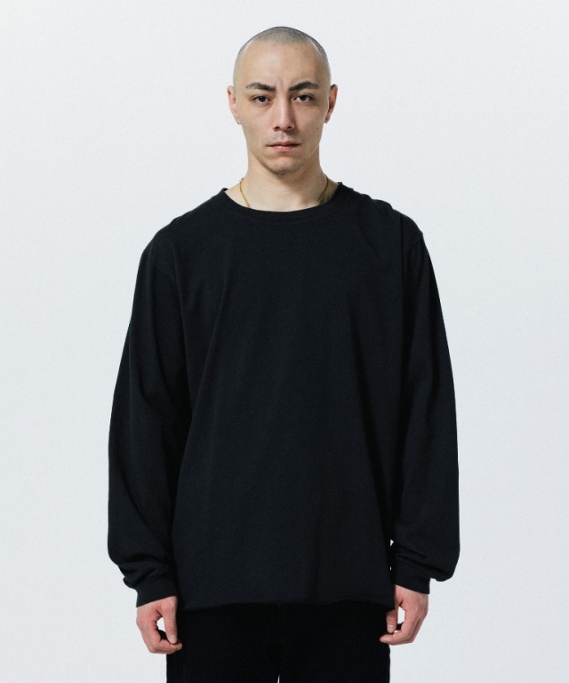 コットン100%のオリジナルボディーを使用した裾断ち切り、ロック始末仕様のロングスリーブティーシャツ。