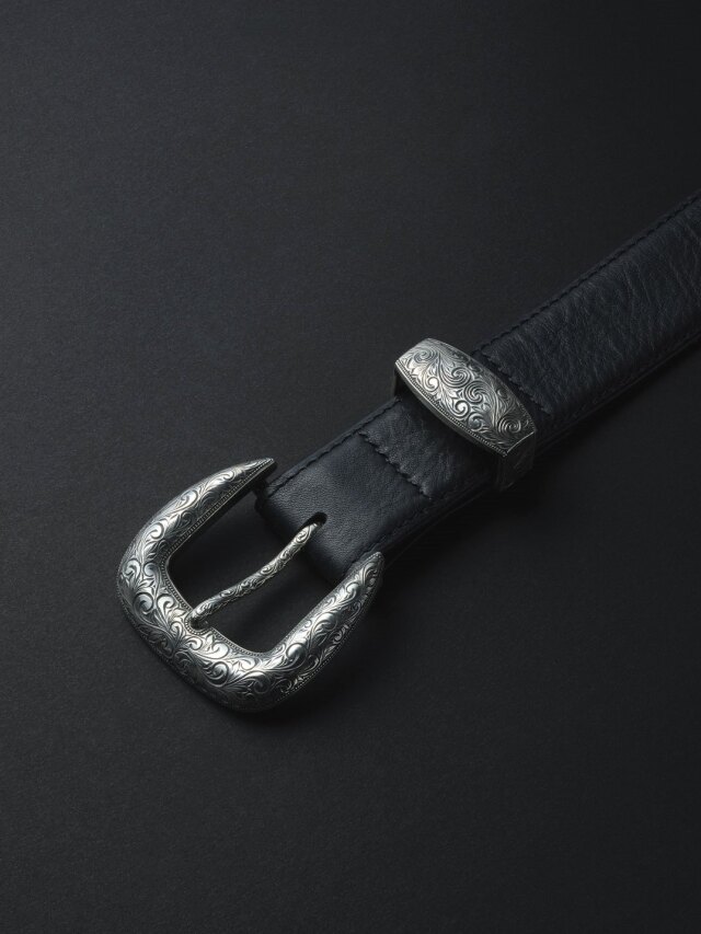 オーナメント柄の彫金を施したSilver950製のバックル、サルカン、剣先が高級感漂うアイテムです。
