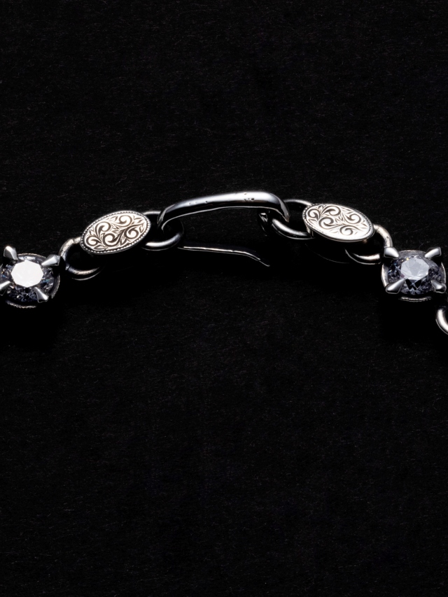 Silver950をベースにジルコニアを使用し、一駒一駒のパーツ全てにオーナメント柄の彫金が入ったEngraved Cutstone Link Braceletです。