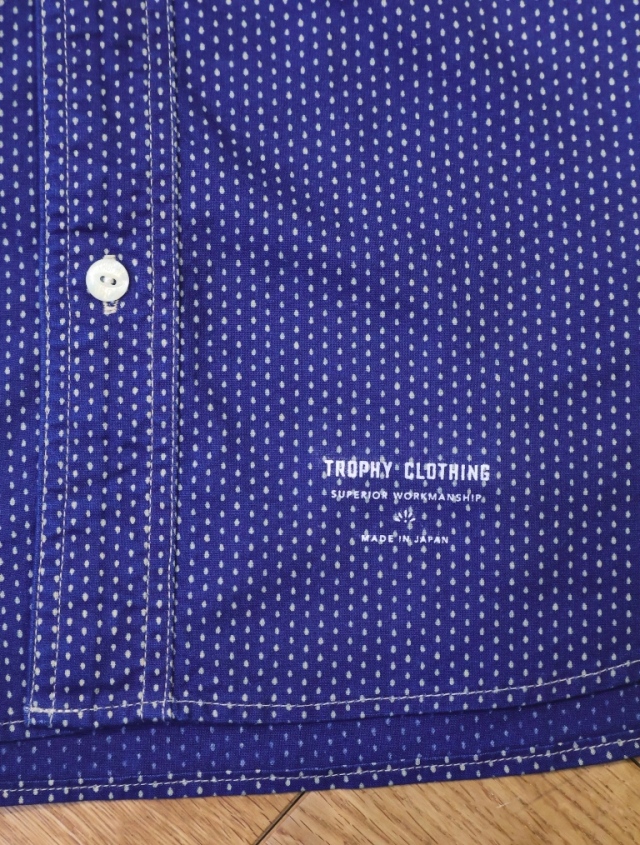 ボタンには刻印入りの猫目貝ボタンを配し、裾にはブランドネームを転写プリントで配置。